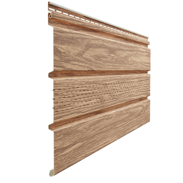 Софит с центральной перфорацией применяется для подшивки свесов кровли, перфорация в центральной части панели служит для поступления воздуха в вентиляционный зазор кровельного”пирога”. Цветовая гамма софита Docke Lux имитирует структуру ценных пород дерева.