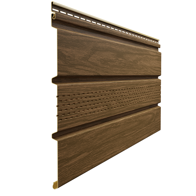Софит с центральной перфорацией применяется для подшивки свесов кровли, перфорация в центральной части панели служит для поступления воздуха в вентиляционный зазор кровельного “пирога”. Цветовая гамма софита Docke Lux имитирует структуру ценных пород дерева.