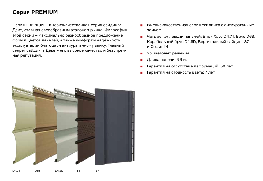 Серия Премиум винилового сайдинга Дёке уже давно стала эталоном на рынке строительных материалов. Качество продукции подтверждено как монтажными бригадами, так и сотнями тысяч частных заказчиков. Виниловый сайдинг Дёке более 15 лет успешно эксплуатируется во всех климатических зонах нашей страны от морозной Сибири до жаркого юга. Серия Премиум это 13 вкусных цветов на любой вкус, антиураганный замок с двойным загибом на всех панелях обеспечивает надежную защиту от дождя и ветра, полный комплект необходимых для монтажа профилей и аксессуаров и самое главное демократичная стоимость, доступная любому бюджету.Профиль D 4,5DUTCHLAP – Корабельный брус самый популярный отделочный материал для фасадов во всем мире.