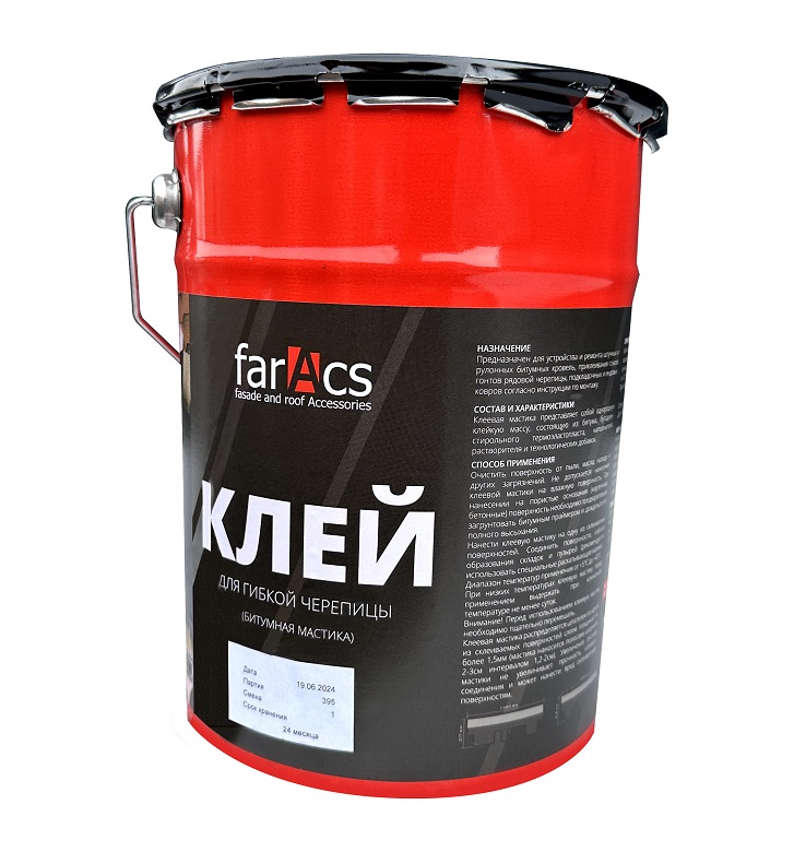 Битумный клей farAcs применяется для герметизации нахлестов подкладочного ковра, приклеивании гибкой черепицы в местах ендов и примыканий к стенам и трубам, приклеивании к металлическим фартукам.