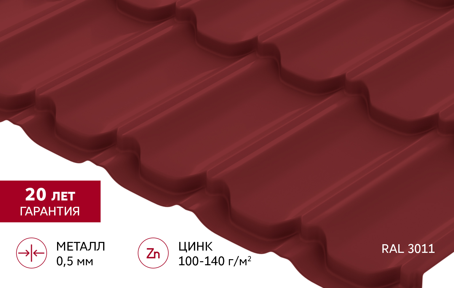 Металлочерепица, изготовленная из стального листа, толщиной 0,5 мм самая надежная на сегодняшний день. Она выдерживает большие снеговые нагрузки. Для толщины металла 0,5 мм производители предлагают самый широкий ассортимент покрытий – от классического покрытия Полиэстер, до инновационных материалов с Полиуретановым верхним слоем. Богатый выбор цветов поможет воплотить любые дизайнерские решения для Вашего дома.