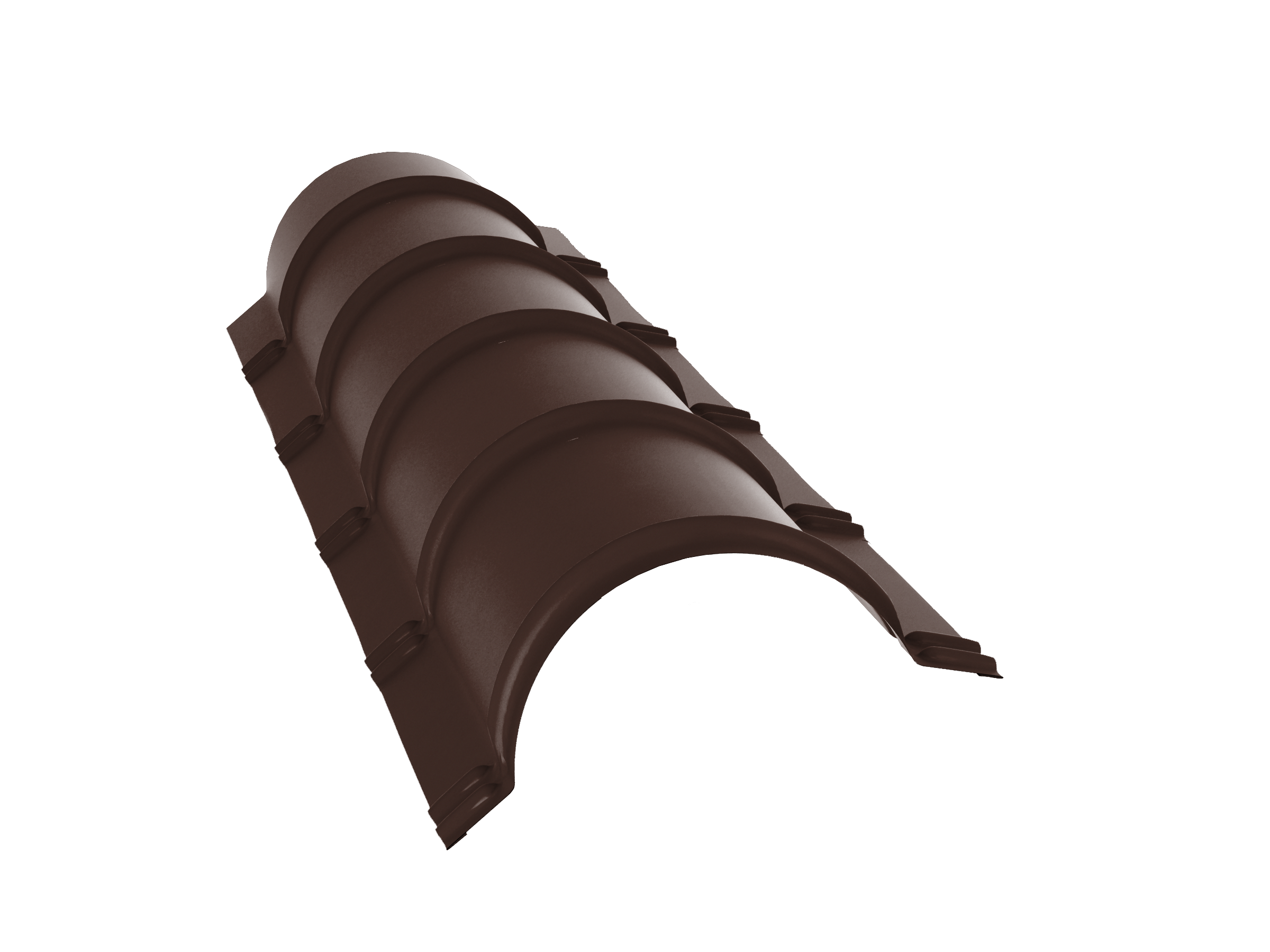 Планка конька полукруглого защищает от атмосферных осадков коньки кровли, носит декоративную функцию. В торцы полукруглого конька необходимо устанавливать торцевые или конусные заглушки, длина планки 1,97м. Рекомендуется установка рулонного аэроэлемента под коньковую планку. Матовое полимерное покрытие Drap.