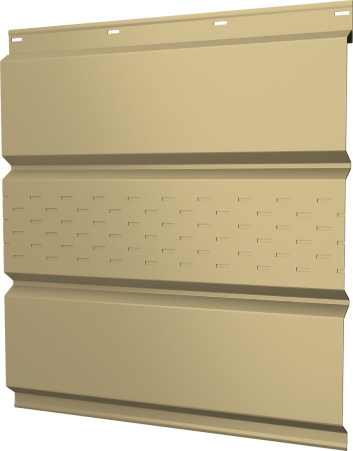 Металлический софит с центральной перфорацией для подшивки свесов кровли, может применяться в для отделки потолков в т.ч. террас, беседок, крылец. Софит GL производится под заказ в диапазоне длин от 0,2 до 6 метров, с шагом один сантиметр, площадь панели рассчитывается по полной ширине 357 мм, полезная ширина панели составляет 326 мм. За заказы менее 25 кв.м. может взимается наценка.
