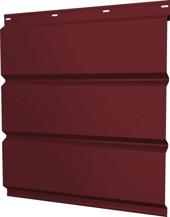 Металлический софит с центральной перфорацией для подшивки свесов кровли, может применяться в для отделки потолков в т.ч. террас, беседок, крылец. Софит GL производится под заказ в диапазоне длин от 0,2 до 6 метров, с шагом один сантиметр, площадь панели рассчитывается по полной ширине 357 мм, полезная ширина панели составляет 326 мм. За заказы менее 25 кв.м. может взимается наценка.