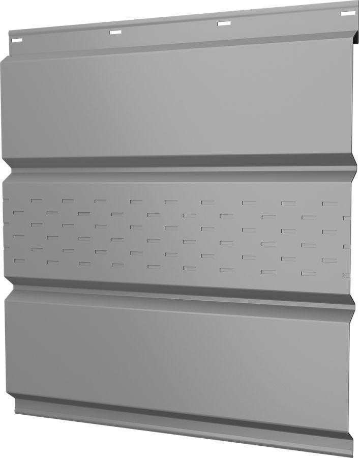 Металлический софит с центральной перфорацией для подшивки свесов кровли, может применяться в для отделки потолков в т.ч. террас, беседок, крылец. Софит GL производится под заказ в диапазоне длин от 0,2 до 6 метров, с шагом один сантиметр, площадь панели рассчитывается по полной ширине 357 мм, полезная ширина панели составляет 326 мм. За заказы менее 25 кв.м. может взимается наценка.