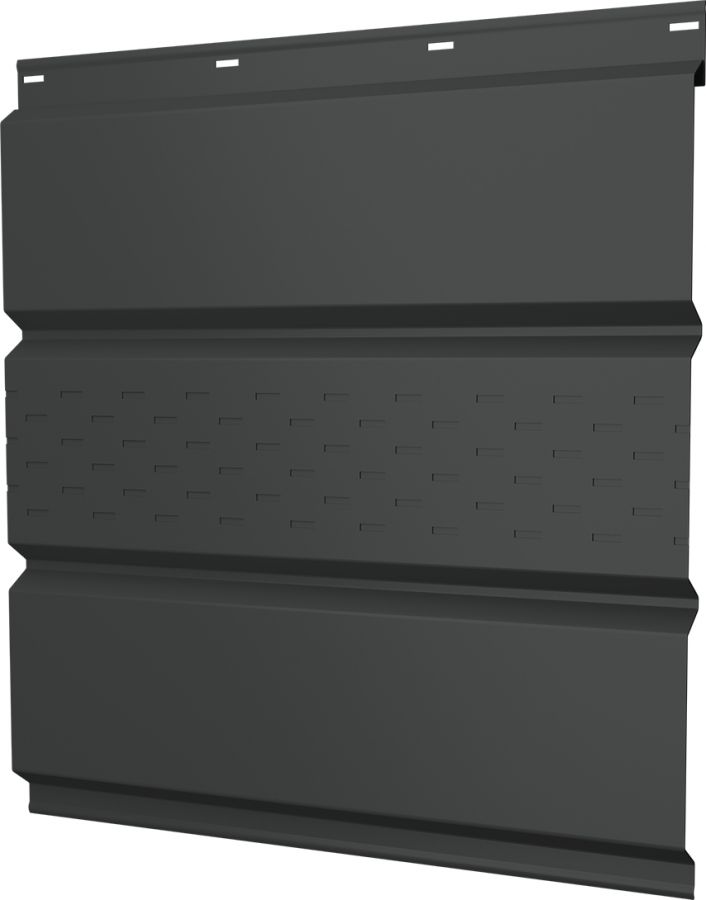 Матовый металлический софит с центральной перфорацией для подшивки свесов кровли, может применяться в для отделки потолков в т.ч. террас, беседок, крылец. Софит GL производится под заказ в диапазоне длин от 0,2 до 6 метров, с шагом один сантиметр, площадь панели рассчитывается по полной ширине 357 мм, полезная ширина панели составляет 326 мм. За заказы менее 25 кв.м. может взимается наценка.
