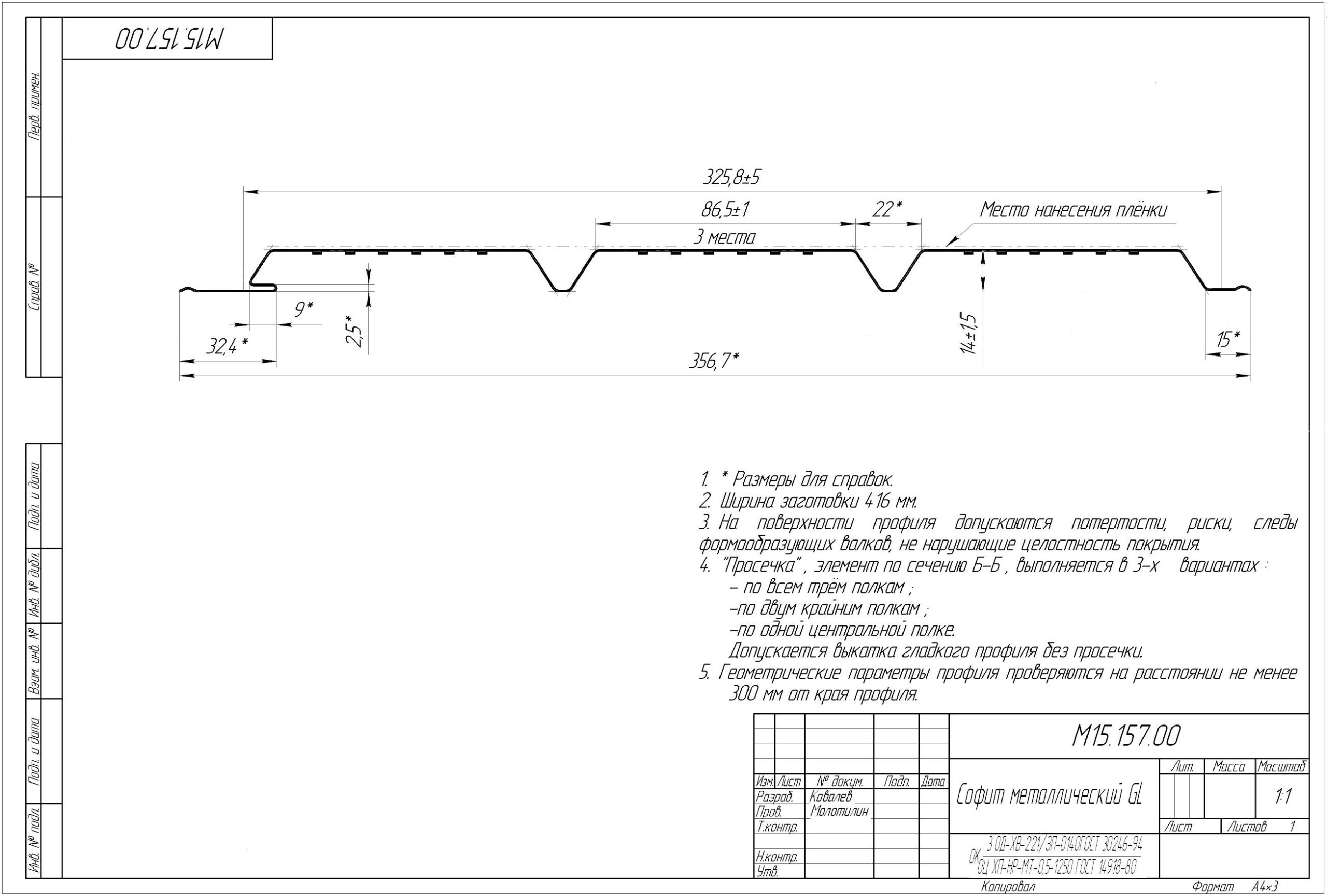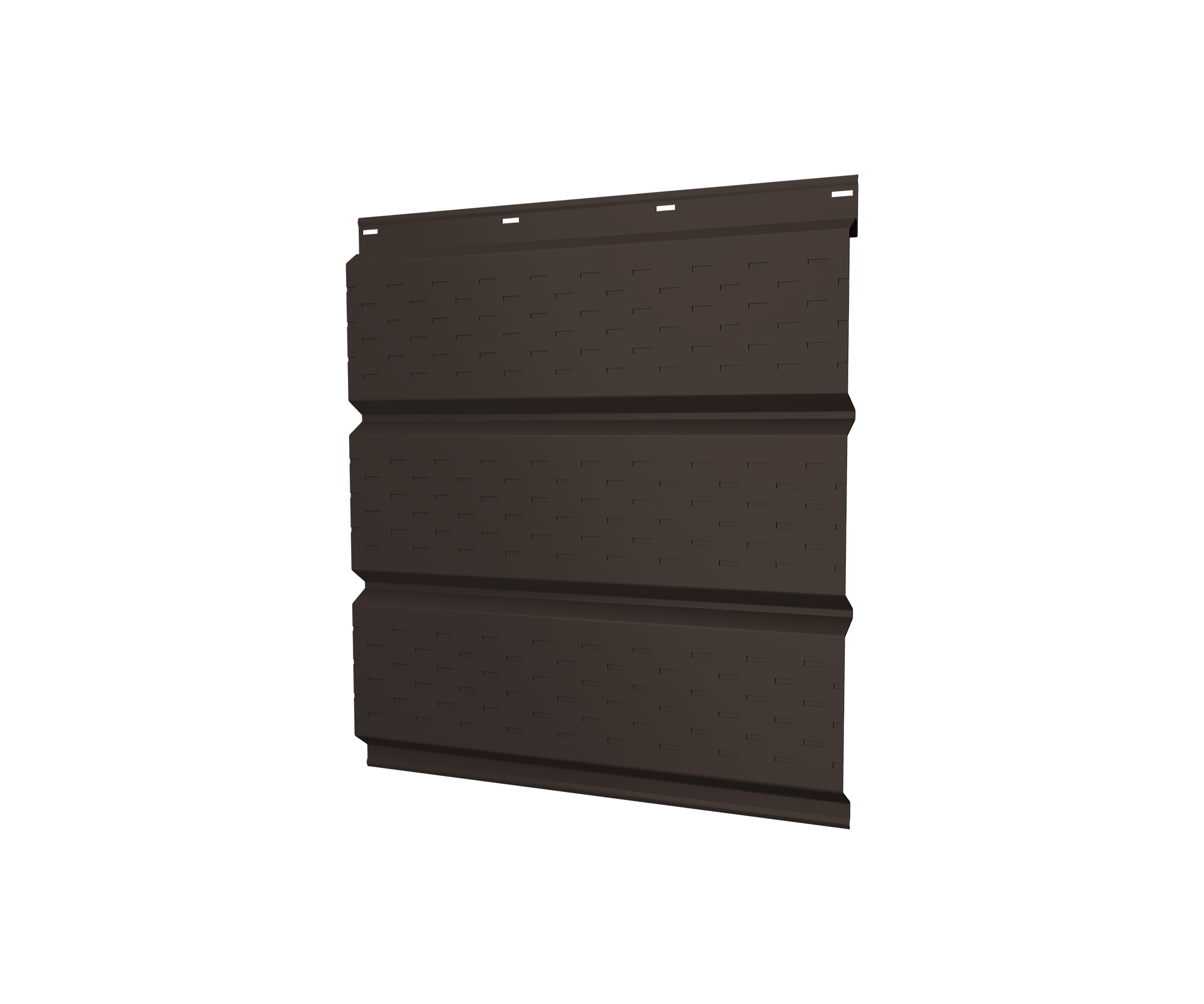 Металлический софит с полной перфорацией для подшивки свесов кровли, может применяться в для отделки потолков в т.ч. террас, беседок, крылец. Софит GL производится под заказ в диапазоне длин от 0,2 до 6 метров, с шагом один сантиметр, площадь панели рассчитывается по полной ширине 357 мм, полезная ширина панели составляет 326 мм. За заказы менее 25 кв.м. может взимается наценка.