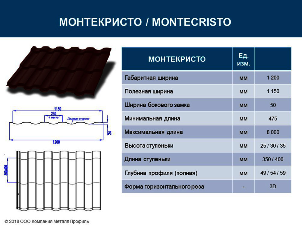 Профиль Монтекристо новинка 2018 г от компании Металлпрофиль. Это сочетание скругленных форм и прямых линий, такой профиль гармонично впишется в любой архитектурный стиль от классики до хай-тек. Отличительными особенностями нового профиля являются усовершенствованный замом вдоль листа, обеспечивающий сто процентную защиту от протечек и горизонтальный 3D рез листов черепицы, с полной достоверностью имитирующий натуральную черепицу.