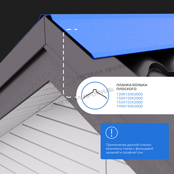 Планка конька плоского 150*150 мм. защищает от атмосферных осадков коньки кровли, носит декоративную функцию. Плоский конек не требует установки торцевых заглушек, длина планки 2м. Рекомендуется установка рулонного аэроэлемента под коньковую планку.