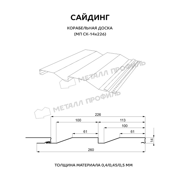 Сайдинг Корабельная доска , изготавливается индивидуально по размерам заказчика в диапазоне длин от 0,5 до 6 м. Расчет площади ведется по габаритной ширине панели 260 мм, полезная ширина панели 226 мм.